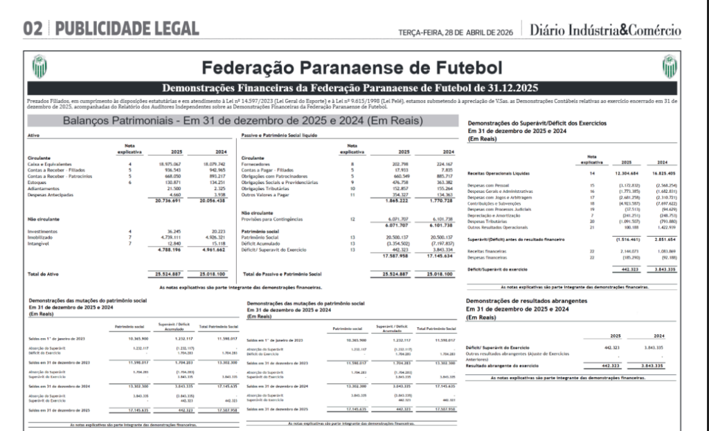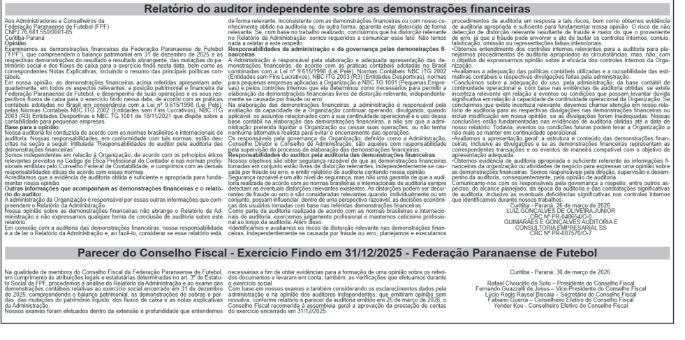 A Federação Paranaense de Futebol informa a publicação de suas Demonstrações Financeiras referentes ao exercício encerrado em 31 de dezembro de 2025, em atendimento às disposições estatutárias e à legislação vigente.