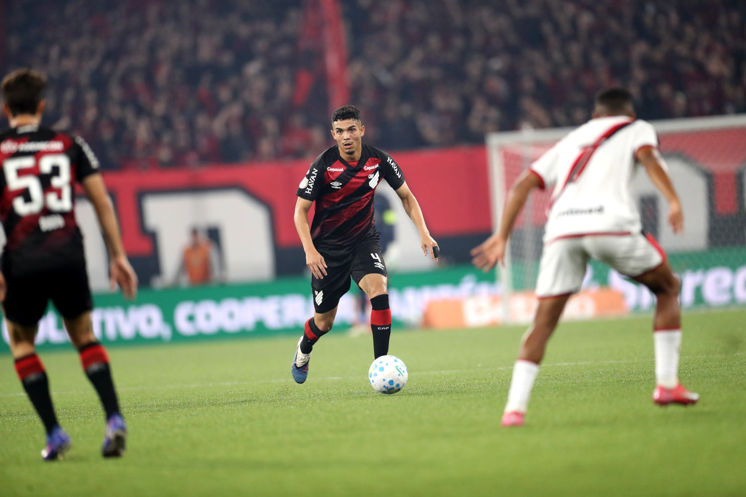 O Atlético Goianiense apostava nos contra-ataques, mas a defesa do Furacão estava bem postada e Santos aparecia com segurança quando o adversário conseguia finalizar.